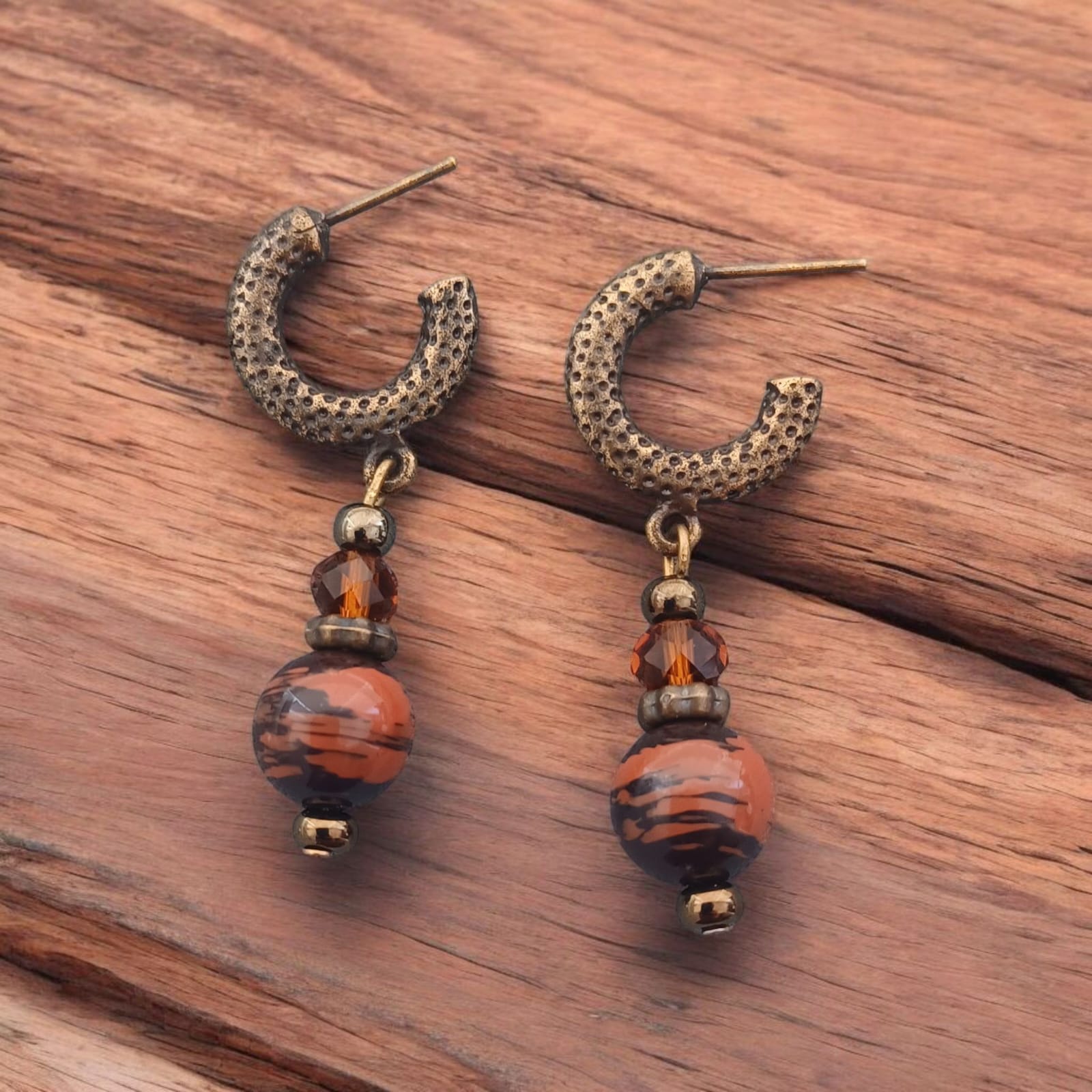 Brinco de argola com banho nacional dourado envelhecido e pigente de cristal com mandeira pintada.