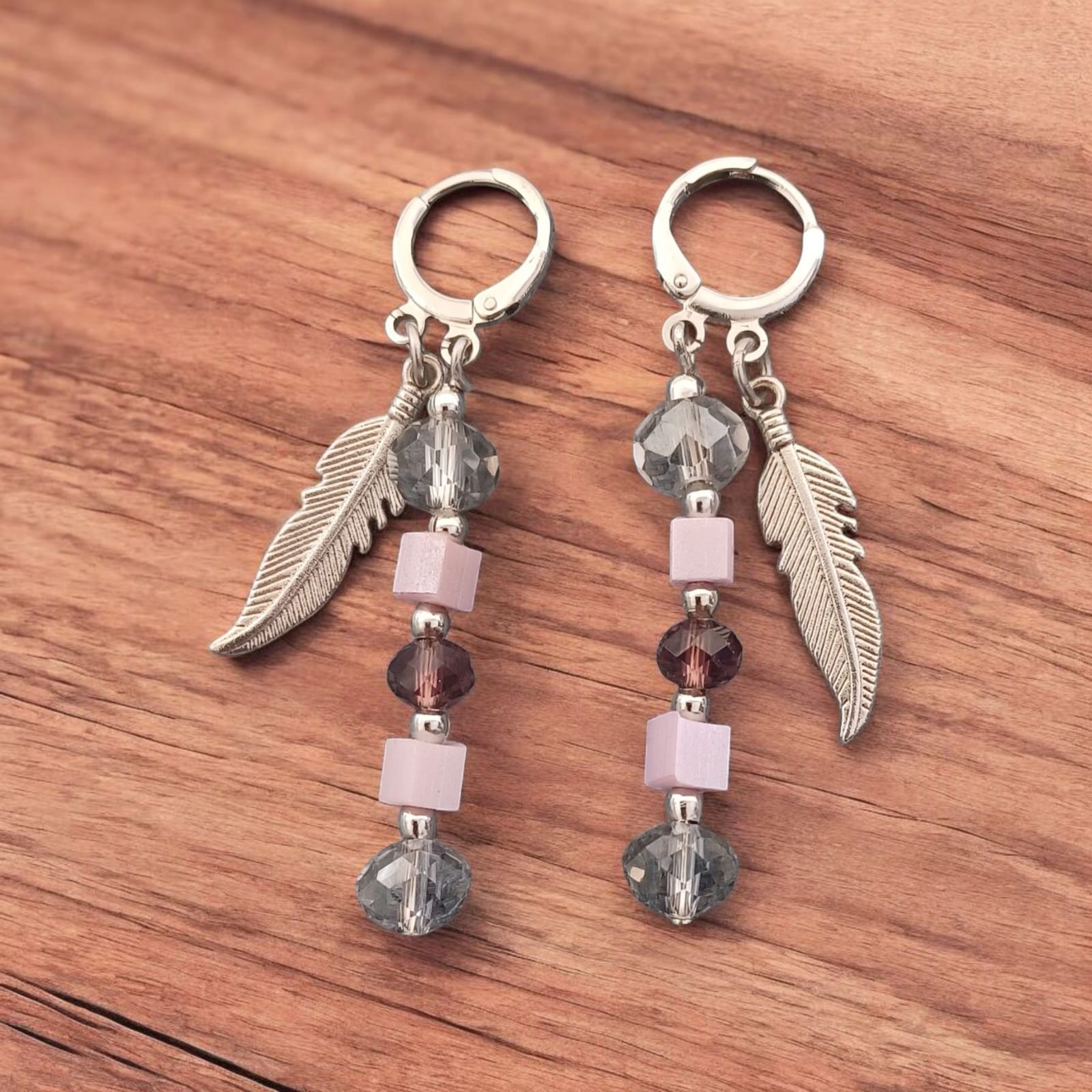 Argola Hipoalergênica (banho de ródio branco) super leve com pingentes em cristais rosa e fumê e pena prateada.