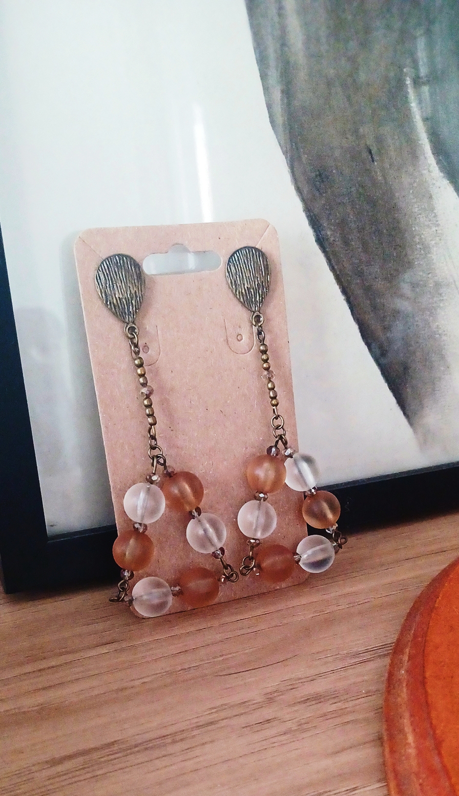 Brinco boho com metais em dourado envelhecido e esferas de resina marrom e branco transparente.