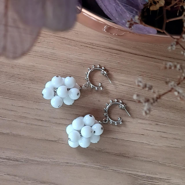 Brinco grande em formato de cacho de uva com esferas em branco.