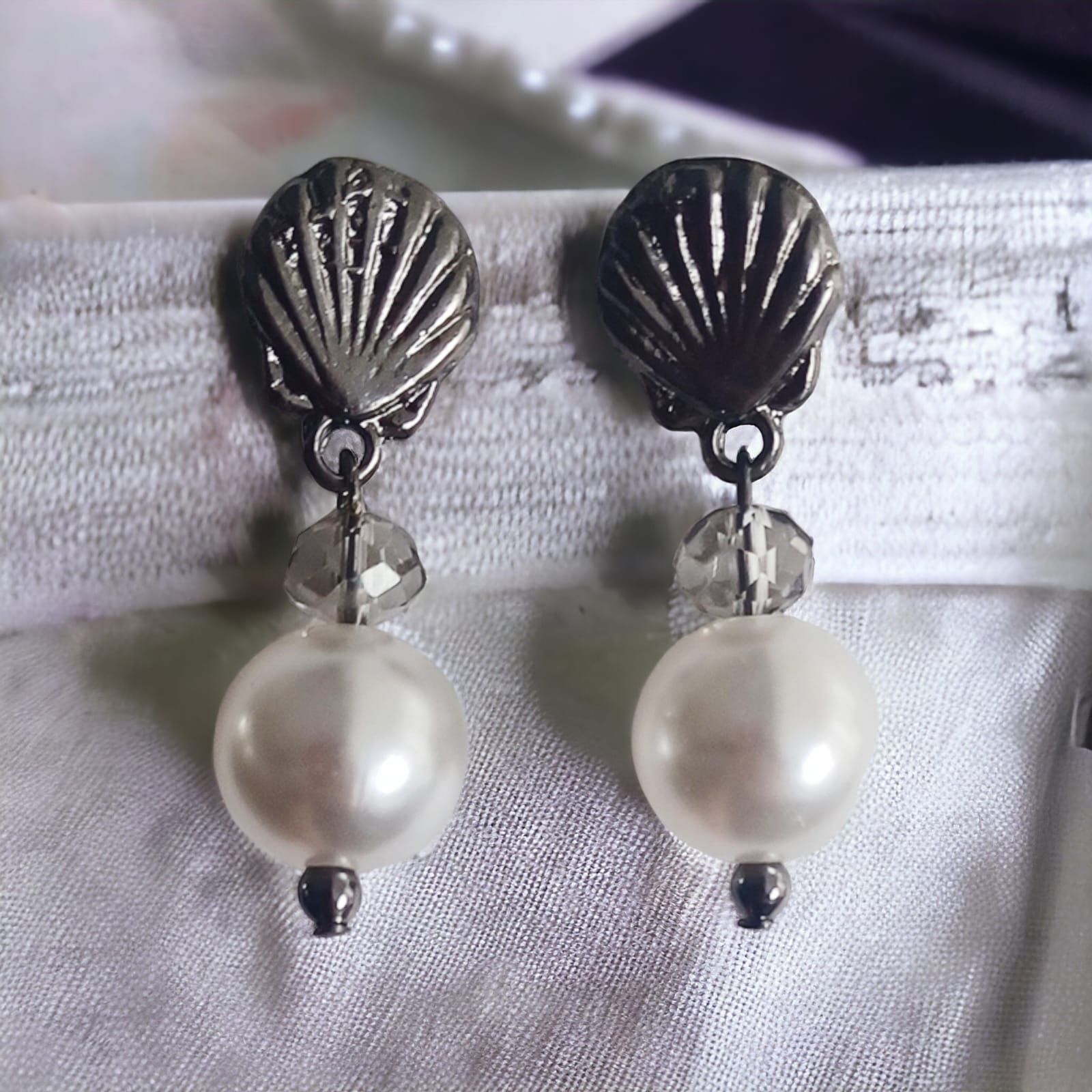 Brinco leve e pequeno com lóbulo em formato de concha e pingente com cristal e pérola.