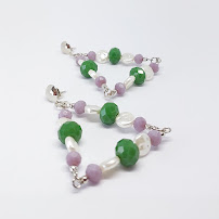Brinco em formato de triângulo com cristais em verde e lilás e pérolas.