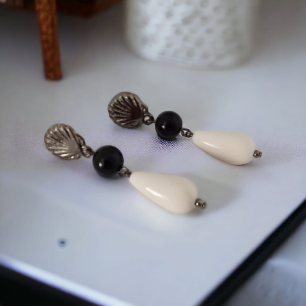 Brinco com pêndulo em esfera preta e gota branca.