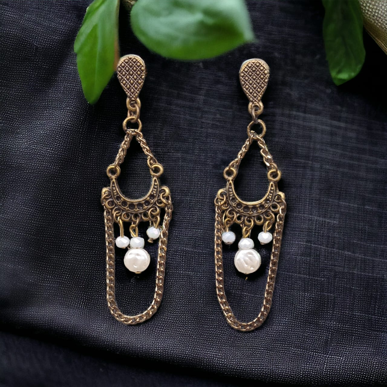 Brinco bohemio com cristais brancos e pérola.
