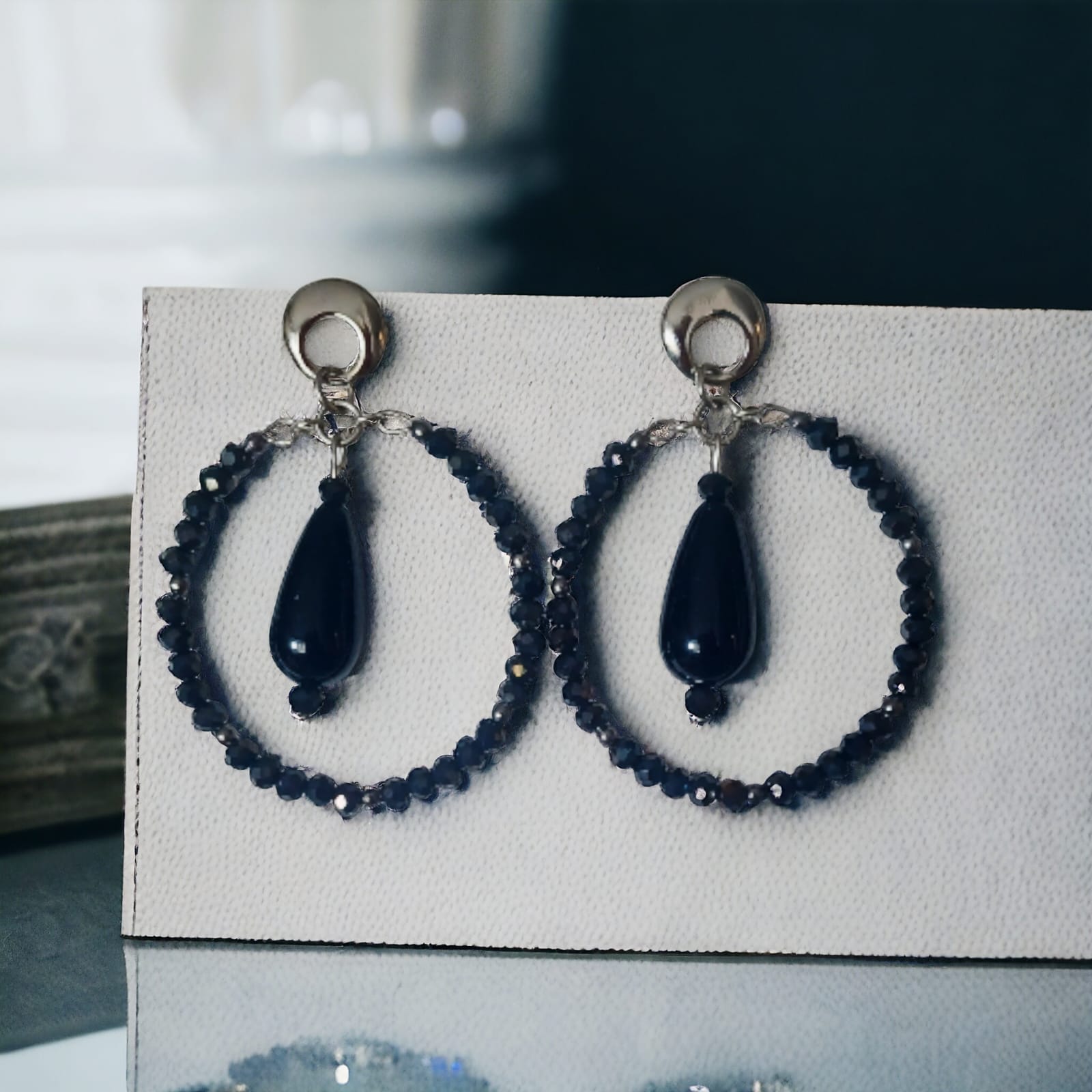 Brinco com arco de cristais pretos e gota preta.